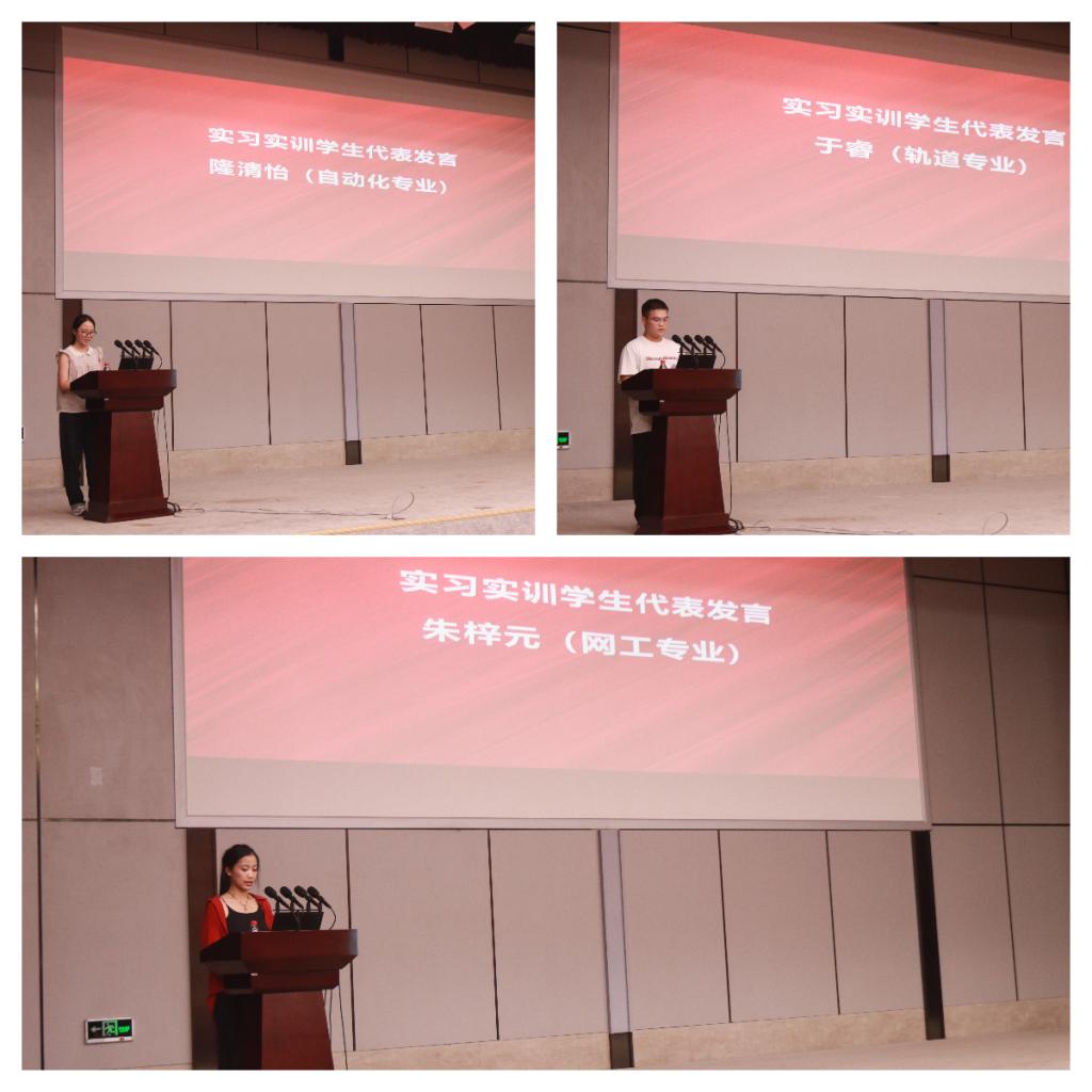 参加本次生产实习的2022级学生代表发言。自动化专业隆清怡以“纸上得来终觉浅,绝知此事要躬行”的真切体会向企业导师致谢,表示实习中工程师的工匠精神和“持续改进”理念为她树立了职业标杆。轨道专业于睿同学形容一周的实习堪称“沉浸式实践课堂”,并表示将以严谨的工程思维为轨道交通事业贡献自己的青春力量。网络工程专业朱梓元同学则勉励大家:技术人不仅是“敲代码”的工匠,更是国家数字基建的“螺丝钉”,应怀揣“小我融入大我”的使命感,由此出发,将所学化为实干。