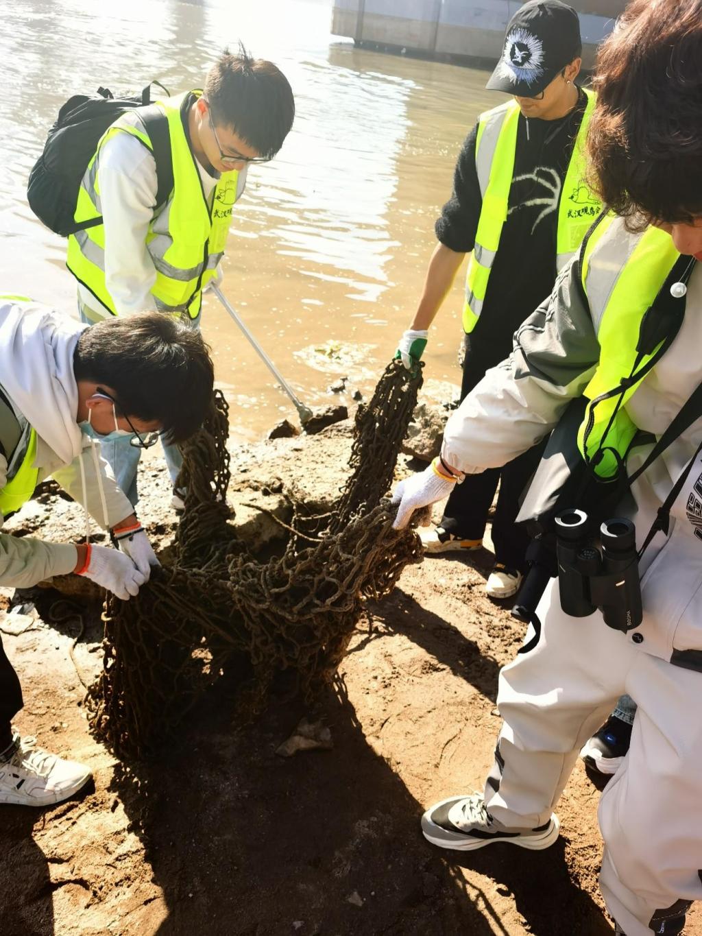 本次志愿活动的主要任务就是在滩涂边清理人们钓鱼所遗留下来的各种鱼钩和鱼线。同学们在老师们的带领下走到天兴洲大桥下的滩涂和石堆上展开了净滩工作,有着丰富钓鱼经验的汤飞老师判断这一片的鱼钩应该不少。