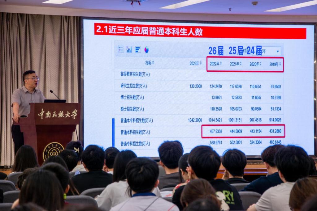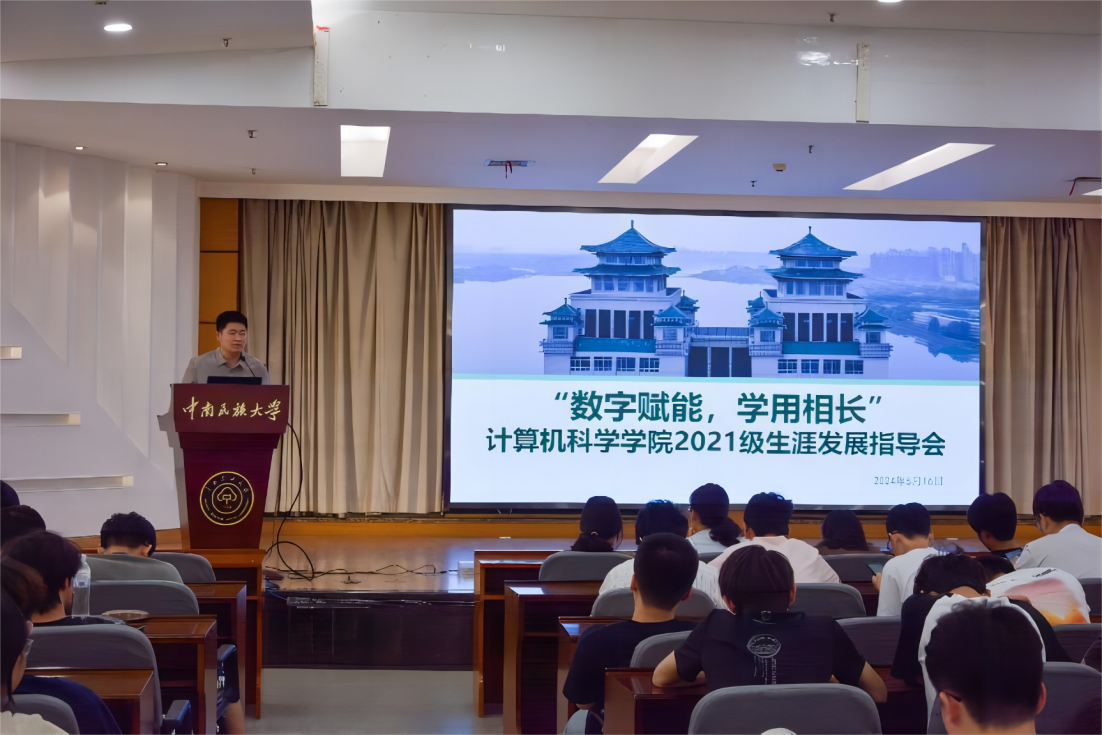为全面贯彻党中央、国务院关于促进高校毕业生就业创业的工作部署,落实必赢国际437官网党委关于推进就业工作的工作要求,深化计算机科学学院党委“铸魂育人、数智强国”党建工作品牌-党建引领扬帆计划之导航工程,提前谋划学院2025年考研升学就业工作,2024年5月16日晚上6:30,计算机科学学院在润良报告厅开展以“数字赋能,学用相长”为主题的生涯发展指导报告会,会议邀请万学教育海文考研湖北分校校长谭晓禹主讲,21级本科生全体辅导员参会、学院21级200余名学生参加,报告会由21级本科生辅导员姚欣雨主持。