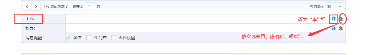 3.学院教学院长审批完成后,教学秘书可看到审批结果,再由教学秘书将学院审批后的调整申请提交教务处审批,主办选择“串”的方式,交办人员依次选择教务处专业建设科秦君、教务处副处长陈晓希、教务处处长胡军浩。
