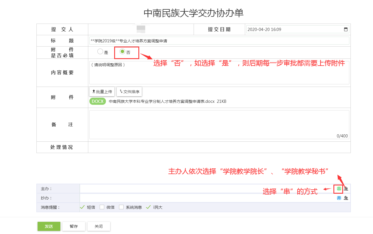 各教学单位: 为保证必赢官网本科专业学分制人才培养方案的顺利实施,学校决定启动线上审批的方式完成各专业人才培养方案异动。具体操作流程如下: 一、填写“必赢国际437官网本科专业学分制人才培养方案调整申请表” 下载地址:教务处主页-相关下载 /jwc/info/1007/1189.htm 二、线上申请及审批 1.申请人登录信息门户-OA办公-交办协办-发送列表-新建,主办选择“串”的方式,交办人员依次选择“学院教学院长”、“学院教学秘书”,提交学院审批。