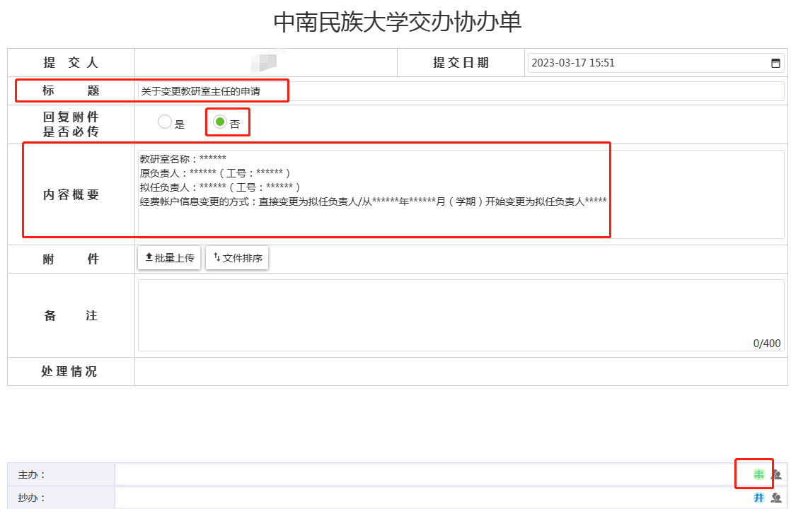 在提交申请时,学院须说明以下内容:教研室(或专业)名称、原负责人、拟任负责人、变更原因等信息。