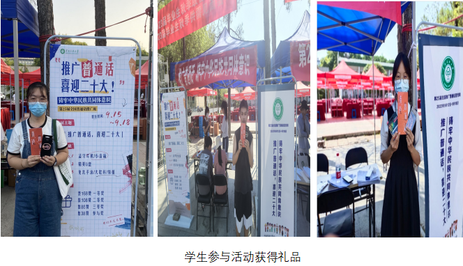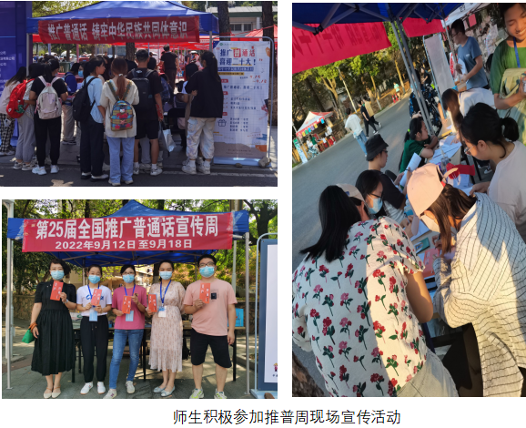 本次推普周紧紧围绕主题,以线上线下结合的方式开展了一系列富有成效的推广活动。活动前夕,通过在公共场所悬挂横幅、张贴海报,在官方QQ发布推普活动宣传“说说”,转发“说说”集赞领奖品等形式,营造了浓厚的推普氛围。推普周期间通过校园广播台、教务处微信公众号等平台开展推普小知识、公益广告视频等推普宣传。9月15日至18日在第一与第二食堂间开展线下展台宣传活动,共发放推普宣传册1000份、书签500套、宣传手提袋150个。另外设置辨析易错字词、读音辨析、成语辨析、接诗句、歇后语、猜字谜、对对子、绕口令等趣味活动,吸引了数千名师生的热情参与。