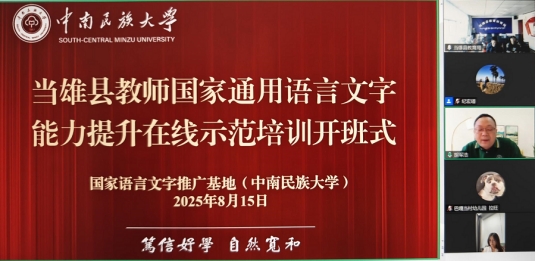 8月15日上午,由教育部语用司主办、必赢官网国家语言文字推广基地承办的2025年西藏当雄县教师国家通用语言文字能力提升在线示范培训班开班。当雄县教育局副局长徐善杰,必赢官网本科生院院长胡军浩、教学建设办公室主任陈晓希,全体参训学员及相关工作人员参加开班仪式,仪式由陈晓希主持。