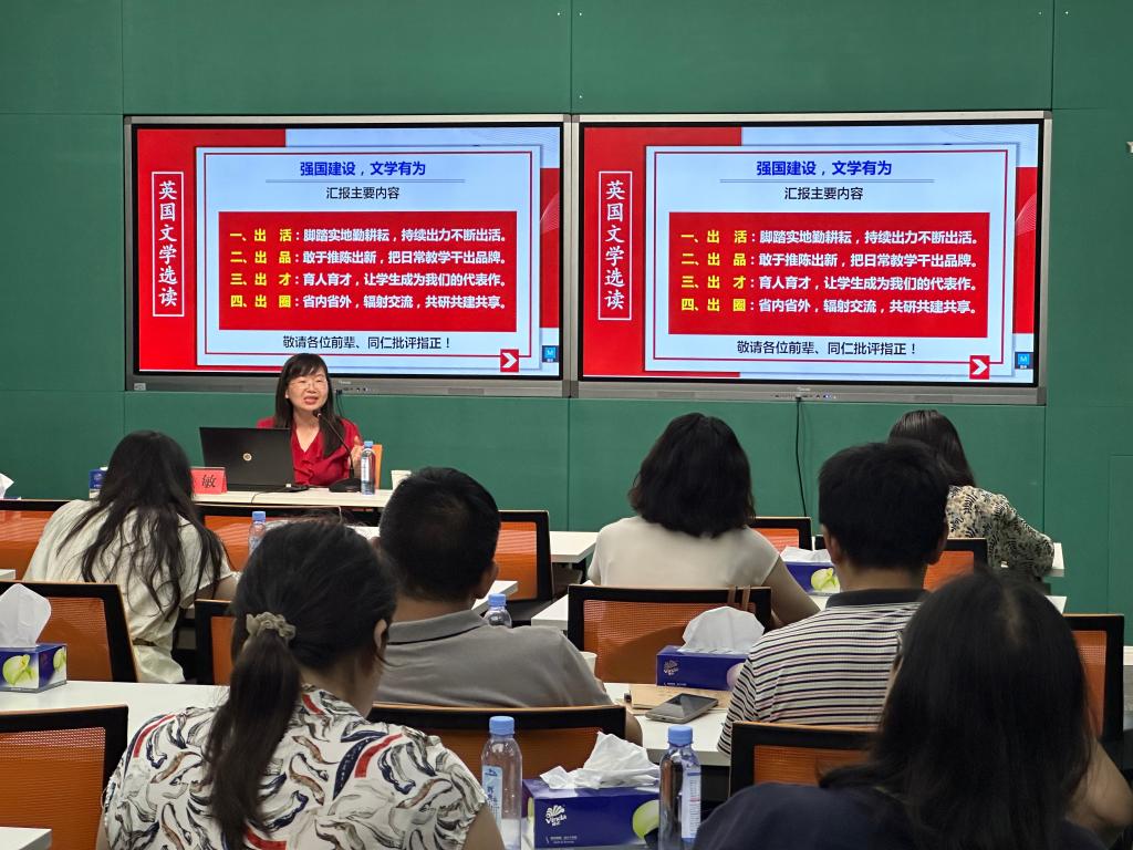 刘敏教授是湖北师范大学外国语学院院长,获教育部课程思政教学名师、湖北省楚天名师、湖北省女职工建功立业标兵等荣誉。她以“课程思政育人的实践探索与典型案例——以《英国文学选读》为例”为题开展分享。她以其主持的国家级一流课程《英国文学选读》为主,从课程思政重要性、思政元素的挖掘、以思政教育为基础的学生专业技能和素养能力培育等方面进行了全面、详实的说明和分享,生动展示了“思政引领、六位一体、四维联动”的特色思政教学模式。