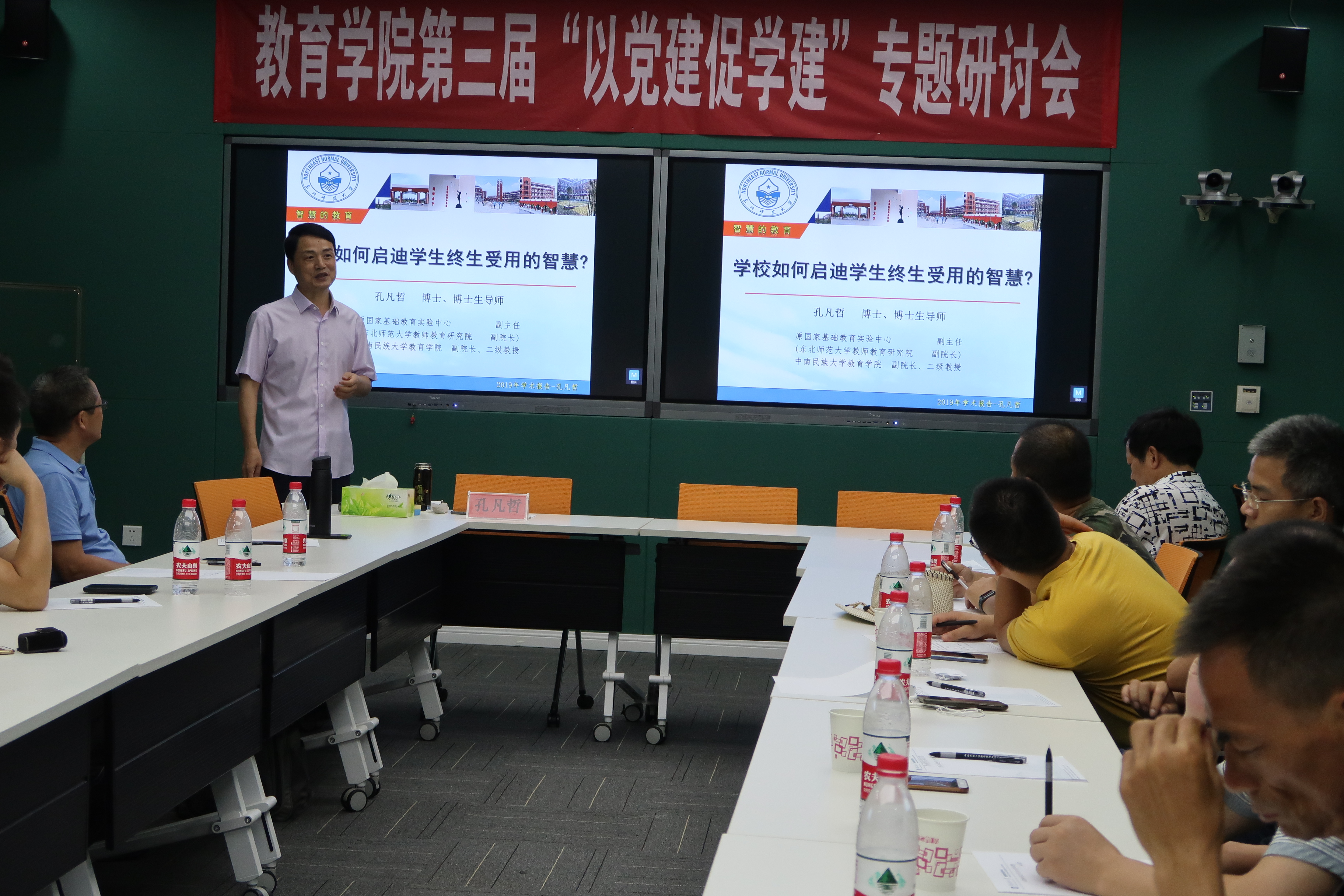 接着教育学院孔凡哲教授就“学校如何启迪学生终生受用的智慧”这一主题,通过十个小故事与各位老师展开交流,孔教授认为,一般的教师教“知识”,好的教师教“过程”,卓越的教师启迪智慧,最后对于中小学如何切实“减负”提出了新的认识和做法。