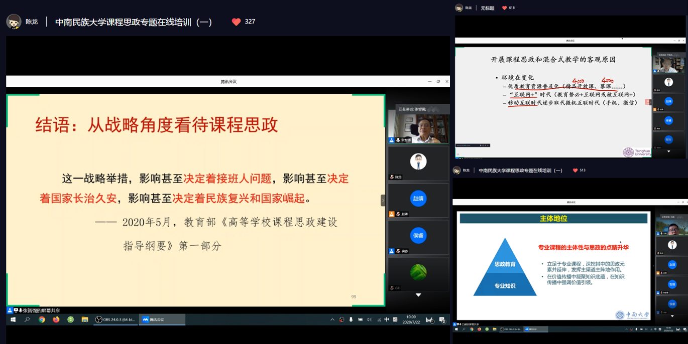 为贯彻落实教育部《高等学校课程思政建设指导纲要》精神,全面推进课程思政建设,7月22日,教师教学发展中心开展了“课程思政专题在线培训(一) ”,来自全国近60所院校的500余名教师参加了此次线上活动。本次活动由中心副主任侯睿主持。 培训特邀到上海中医药大学张智强教授、中南大学王昶教授以及清华大学于歆杰教授,分别围绕思政教育资源的发掘、课程思政教学设计、混合式教学与课程思政等内容进行了全面而详尽的讲解。张智强教授结合上海中医药大学、复旦大学、上海应用技术大学等高校优秀典型课程思政案例,帮助教师们理解专业教学中的“思政”,从专业、课程、章节中发掘思想政治元素。王昶教授以其战略管理课程为例,阐述了“理论学习、案例分析、思政升华——三位一体”的课程思政教学模式设计与实施。于歆杰教授从“正确认识课程思政”、“工科课程开展课程思政”等方面详细介绍了混合式教学模式下如何真正实施课程思政。 培训结束后的问卷调查结果显示,教师们通过本次专题在线学习进一步理解了课程思政的内涵,明确了课程与思政之间的关系,明晰了课程思政教学模式,并深入了解了如何在混合式教学中实施课程思政。 后期,中心会继续开展课程思政系列专题培训活动,以切实提高教师“课程思政”育人能力,更好地推进各类课程与思想政治理论课同向同行。