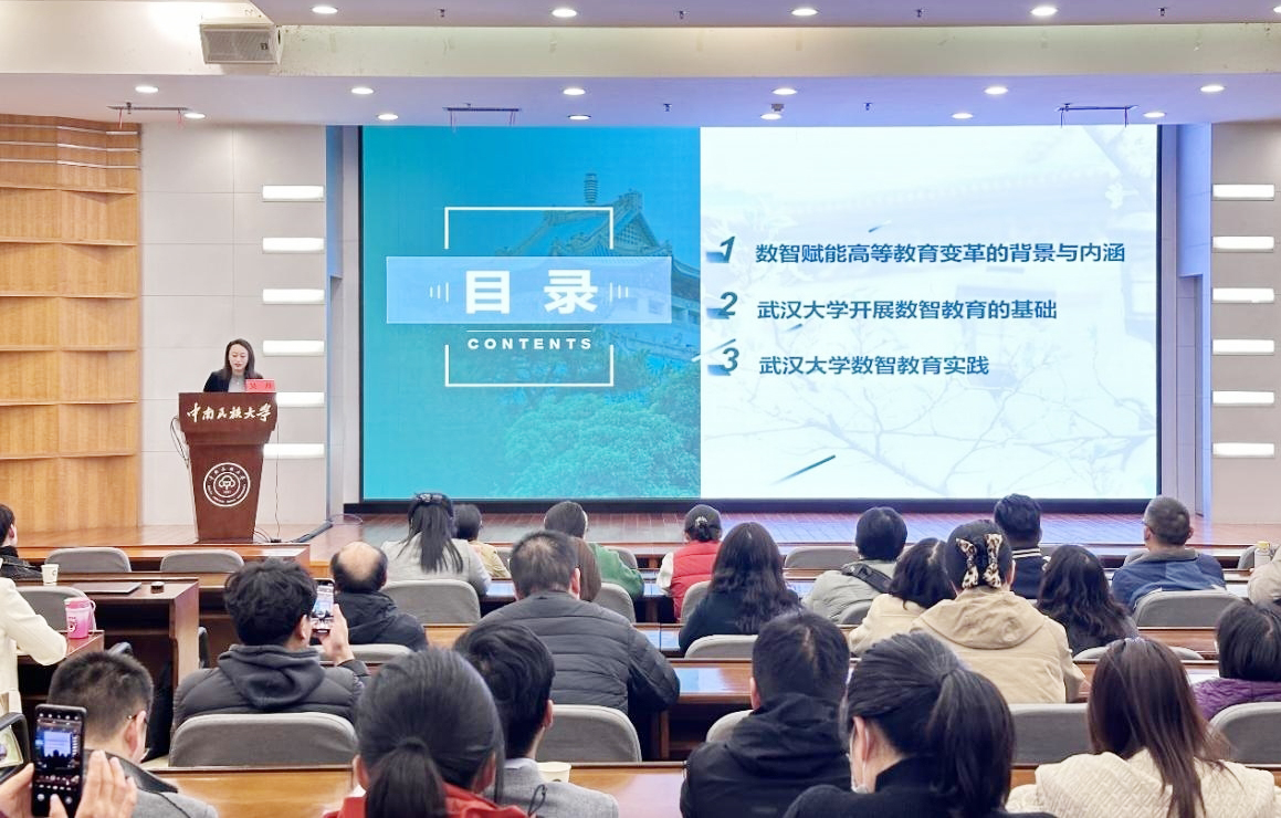 为推动数智教育教学改革创新,探索人工智能技术赋能教育教学的新思路和新举措,3月19日,党委教师工作部(教师教学发展中心)、教务处、信息化建设管理处(现代教育技术中心)联合开展人工智能赋能教育教学改革系列培训第一讲。国家重大人才工程计划特聘教授、武汉大学本科生院院长吴丹教授应邀作题为《数智教育助推高校拔尖创新人才培养——武汉大学数智教育改革》的专题报告。各学院教学副院长、专业负责人、专任教师代表、教学管理人员代表等160余人参加了本次培训。