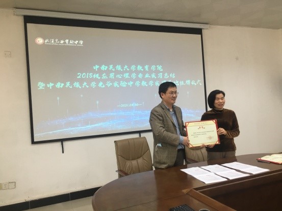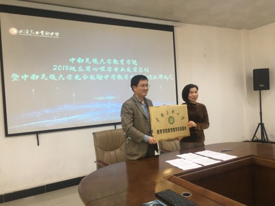 2021年4月30日下午,我院2018级应用心理学专业实习总结大会暨中南民族教育学院教学实习基地挂牌仪式在光谷实验中学举行。光谷实验中学谭小娟副校长、我院罗建河副院长、孙冰副书记、赵冬梅老师、鲍旭辉老师、实习生代表及光谷实验中学部分教师代表参加了本次会议,会议由赵冬梅老师主持。