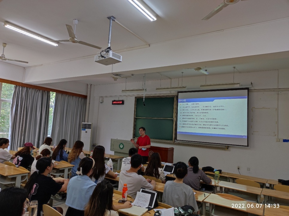 作为学校“课程思政”示范课程的主持人,他注重将思政元素充分融入课程之中,课程思政是教学活动的有机组成部分,虽然学科有差异,但是形式都应该润物无声。《中国教育思想史》蕴含着丰富的课程思政元素,比如孔子因材施教的案例,朱子读书法,白鹿洞书院揭示,“中学为体,西学为用”的历史借鉴,社会改造与青年教育等。通过不同案例或讨论,增进学生对教师角色的认识,体会修身成德的思想,树立了文化自信,提升了创新精神,厚植了家国情怀。