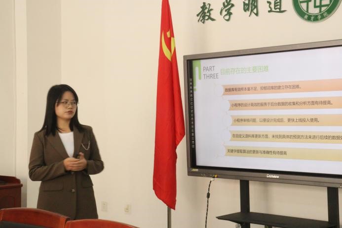 本次大创创新项目中,两支队伍聚焦“疫情下”这一背景,分别对疫情下大学生心理预警模型和大学生人际交往展开研究。答辩过程中,他们分别展示了阶段性成果,列出了目前存在的问题和解决思路,提出了未来的研究计划。