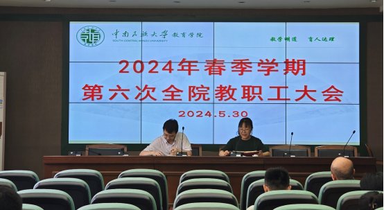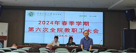 2024年5月30日中午,教育学院于15号教学楼741会议室组织召开了2024年春季学期第六次全院教职工大会暨本科教育教学审核评估工作推进会。学院领导及全体教职工参与会议。会议由学院党委书记林晋主持。