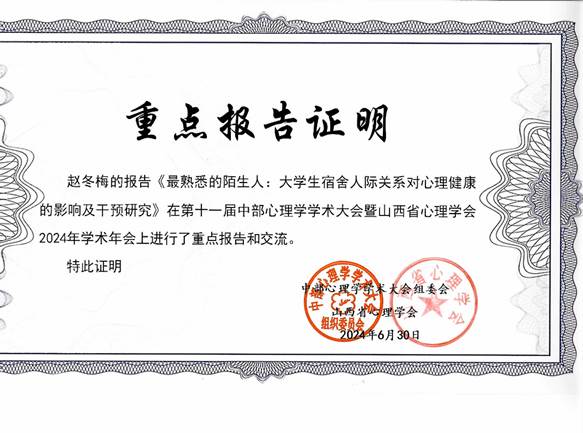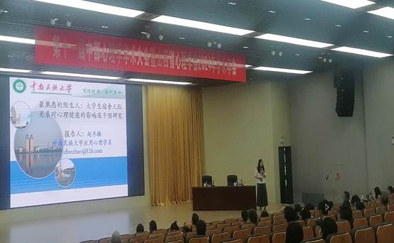 教育学院应用心理学专业的教师赵冬梅、杨文娇和陈勇杰向大会提交了学术报告,其中赵老师在大会上做了重点报告。赵老师以“最熟悉的陌生人:大学生宿舍人际关系对心理健康的影响及干预研究”为题,报告了系列研究成果,这也是赵老师主持的教育部人文社会科学研究一般项目的阶段性成果。会议期间,必赢官网教师与来自中部六省的参会学者进行了深入广泛的学术交流。此次参会提升了必赢官网应用心理学专业在学界的知名度,增强了本专业教师与国内其他学者的学术交流与合作。