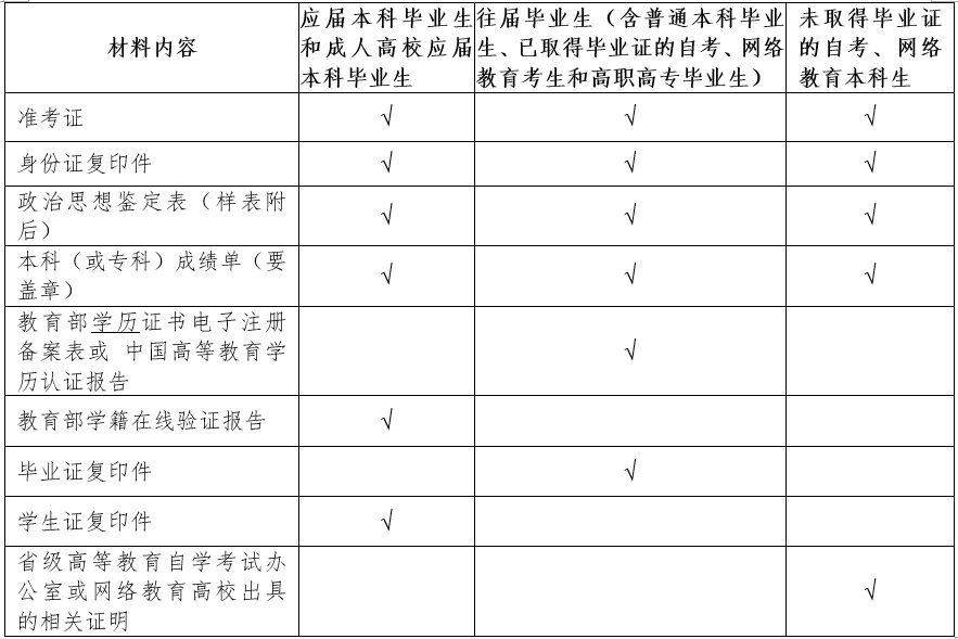 考生须按时提交准考证、身份证和毕业证书(2024年的应届本科毕业生提供学生证)等相关材料复印件。学院在复试之前,对考生的报名资格进行严格审查,仔细核对。学院积极运用“人脸识别”“人证识别”等技术,并通过综合比对“报考库”“学籍学历库”“人口信息库”“考生考试诚信档案库”等措施,加强对考生身份的审查核验,严防复试“替考”。对弄虚作假、不符合教育部报考规定者,不予复试。不同类别的复试考生须按照如下表格所列要求提交资格审查材料。