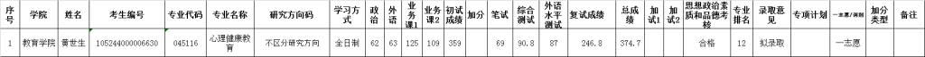 根据学校2024年硕士研究生招生拟录取指标调整安排,教育学院心理健康教育专业拟增加1个拟录取指标,按照候补生源总成绩排名依次递补原则,拟录取黄世生。具体名单详见附件。