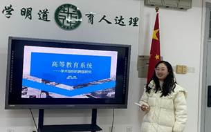 12月4日晚,教育学院在15号教学楼727教室举办了“四百工程”系列之“百篇研读”第67期研究生读书分享会,分享的主题是多视角探讨《高等教育系统》核心内容。本次活动特邀教育学院胡炳仙老师担任点评嘉宾,由2024级周毅、张楚楚、沈晨、向梦梵、丁小雪、马旭迪六位同学分别进行读书分享,活动由马旭迪同学主持,2024级高等教育专业研究生全体参加。