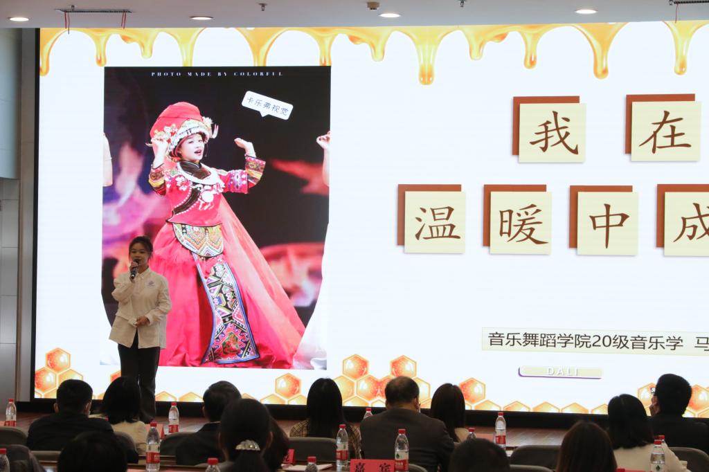 各位暖闻讲述人讲述的奋进故事赢得了观众们阵阵掌声。教育学院研究生李凯勇敢揭开自己儿时被抛弃的伤疤,回忆了自己追随中国共产党、不断走向精彩未来的铿锵步伐。法学院杨胜源说自己的经历就像一部电视剧,短短几天,家庭从富裕到贫穷、自己从衣食无忧到被追债人堵在家门口,凭借资助,如今的她,曲折而又顽强地飞向了自己的天空。管理学院冉丽说自己从朴素的“桃花源”中来,她深爱滋养她的土地,但比谁都渴望走出大山,获得过国家助学金的她深信“生活虽苦,但它值得”,因为“前行路上总有阴影,但抬头便是阳光”。生科学院杨园云以《逐梦﹡筑梦》为题,讲述了自己四姐弟的求学之路,在党和国家的关怀下,她逐梦的步伐愈来愈坚实……