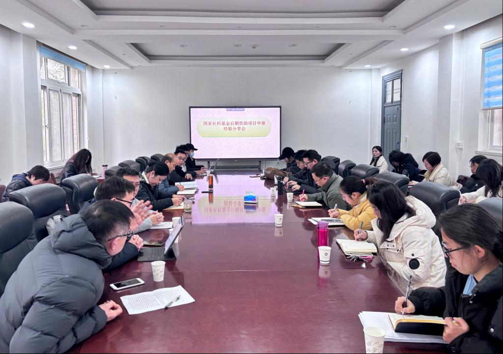 本站讯(通讯员:宋欣宇 摄影:宋欣宇)为进一步落实好2025年国家社科基金后期资助项目申报工作,2024年12月27日上午,学院在文1楼203会议室举行国家社科基金后期资助项目申报经验分享会,学院副院长陈峻俊教授主持会议。