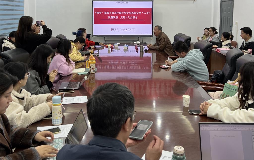 本站讯(通讯员:李长威 邵佳欣 摄影:李长威 邵佳欣)11月28日晚,学院邀请中央民族大学中国语言文学学部副主任、博士研究生导师钟进文教授在文一楼203会议室做《“铸牢”视域下重写中国文学史与民族文学“入史”问题回顾与反思》讲座。讲座由杨彬教授主持,学院相关专业的老师、博士生硕士生和部分本科生参加。