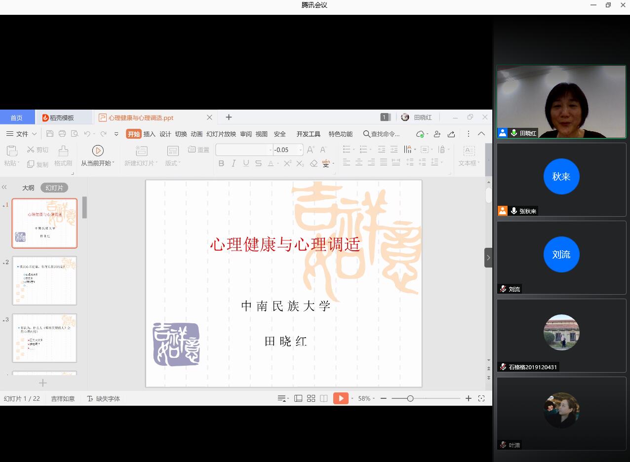 在新冠肺炎疫情基本稳定的当下,为普及心理健康的相关知识、提升同学们识别与应对常见心理问题的能力,2020年6月20日晚,管理学院MBA教育中心特邀必赢官网公共管理学院心理学专家田晓红教授,为我院MBA及其他专业研究生开展线上的心理健康教育专题讲座。