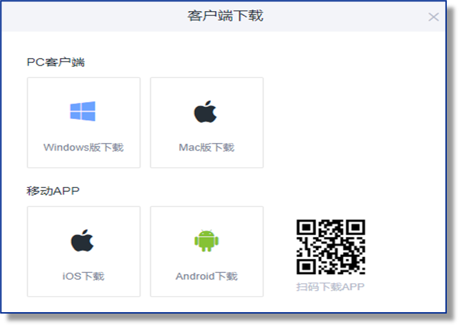 PC客户端: 支持windows和mac系统。登录网页端之后点击右上角的“客户端下载”,根据您的设备选择下载相应的移动端和PC全功能客户端。移动端也可以直接扫以下二维码进行下载
