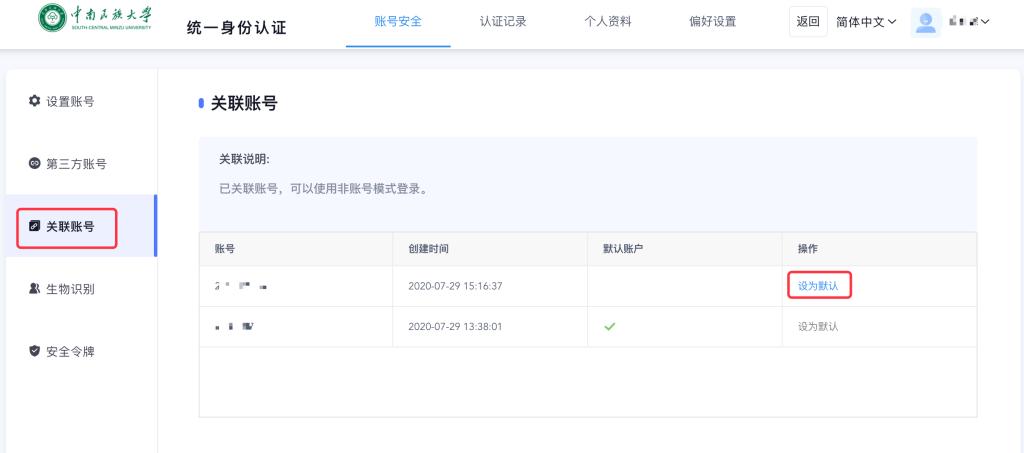 同一个用户仅有一个手机号码在校内拥有多重身份和多个帐号是个特殊场景,通常遇到问题都与绑定了同一个手机号有关,系统默认将最后开通的账号设为主账号,因此,当需要使用另一个帐号身份时,需要选用拟作为默认身份的账号登录信息门户,登录后找到个人中心里关联账号菜单项,设置默认账号,如图4所示,未来需要变更默认账号,同样按此步骤操作。