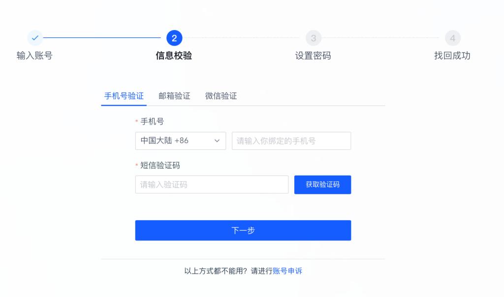 为了方便用户找回密码,统一身份认证系统可选择手机号、邮箱、微信三种方式的任意一种来自助找回密码,如图2所示。需要注意的是,手机号、邮箱、微信这三项信息,可以在信息门户的个人中心页面中进行维护修改,当你激活帐号成功后,一定要记得去添加这些信息,这样会在忘记密码时更方便的进行自助找回,同时绑定微信也解锁了“微信扫码”验证这一新途径。