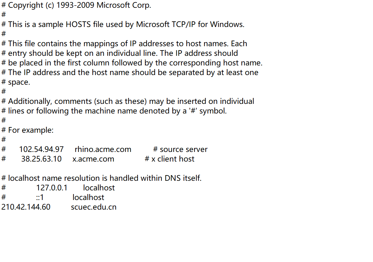 2、将hosts文件复制到桌面后,在里面追加一行:210.42.144.60 scuec.edu.cn;