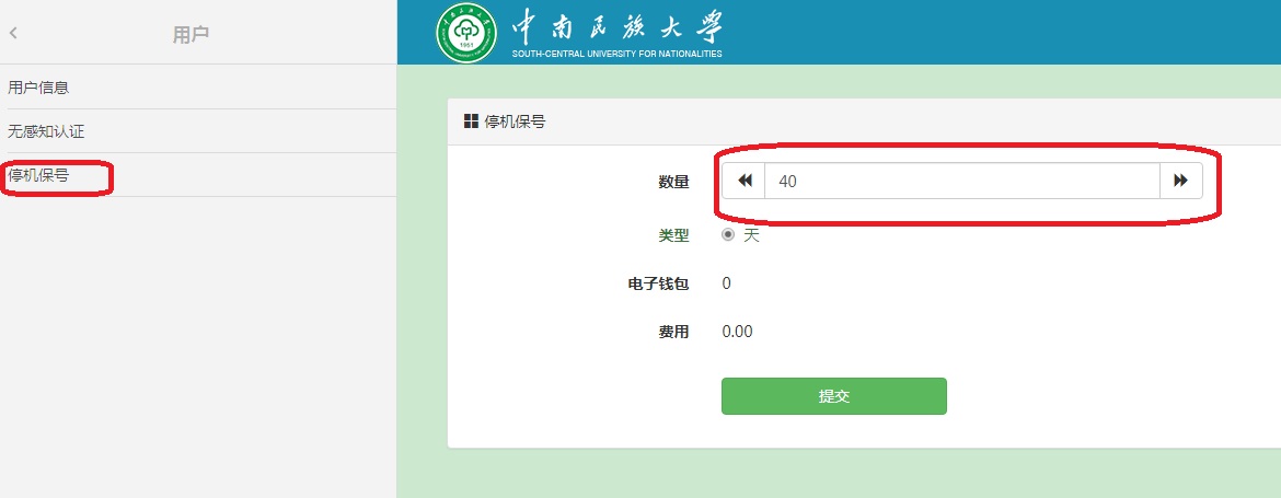 步骤3:点击左侧菜单栏“用户”选项卡,进入子菜单,点击“停机保号”选项卡,如下图所示。