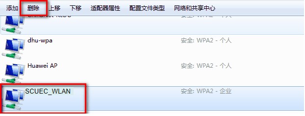 (1)如果您之前连过SCUEC_WLAN,且配置不成功的,请先“删除”此网络;