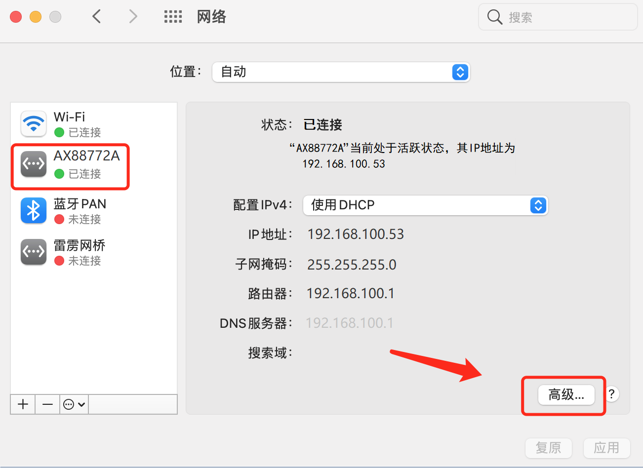 3.找到你要设置的网络对象,选择需要设置的网卡,点击右下角的"高级"选项。