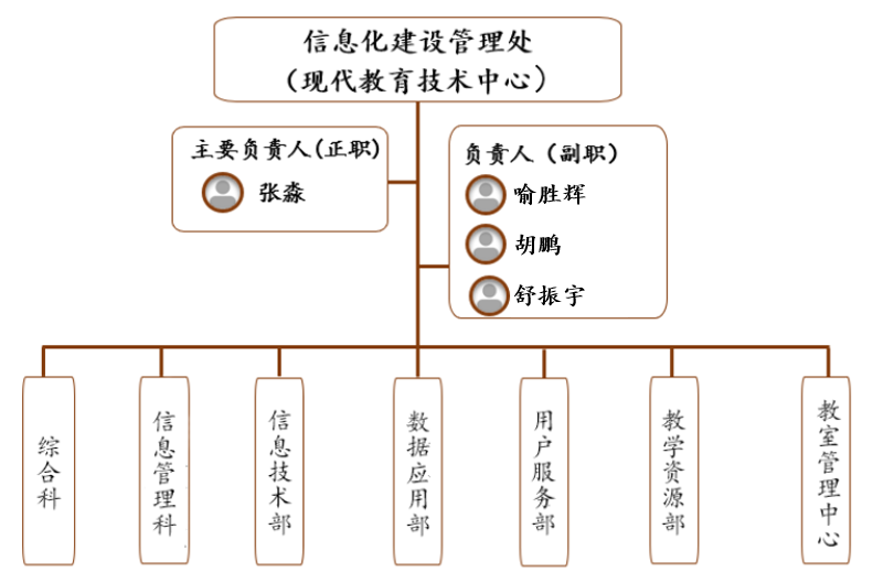 信息化建设管理处(现代教育技术中心)下设综合科和信息管理科2个科级机构,设信息技术部、数据应用部、用户服务部、教学资源部、教室管理中心5个内设机构。