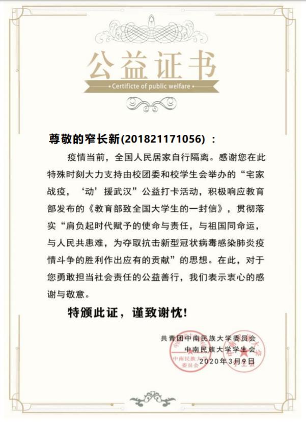 做为一名学生,窄长新认为首要任务应当是学习,重心应把握在学习上。勤奋好学的他获得了学校2018-2019年度的优秀学生二等奖学金以及文体佳绩奖学金,笃信好学是他的个人写照。当注意到班级里有同学在学习上需要帮助时,他便主动承担了该同学的学业帮扶工作,还时常与之交流其学习进度。