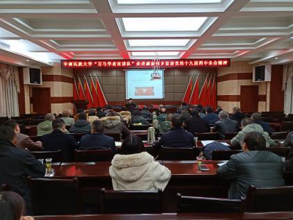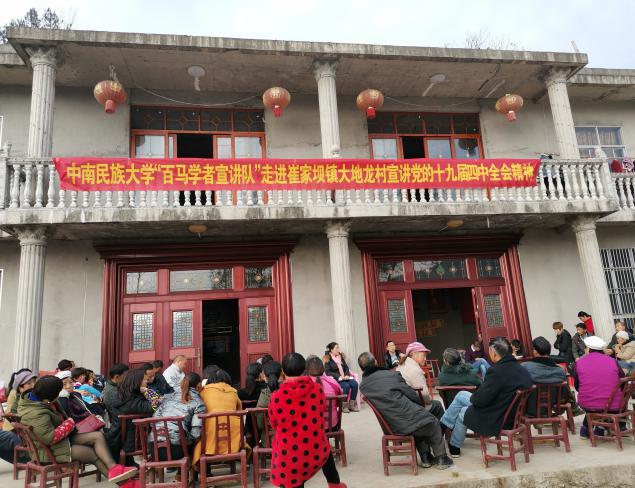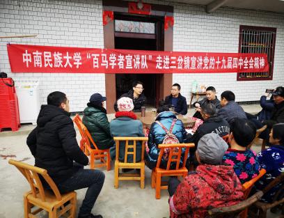 按照省委宣传部、省委讲师团“百马学者宣讲行动”统一安排,2019年12月30日至31日,我院马克思主义学院,湖北省中特中心民大分中心成员、省委讲师团恩施理论热点面对面示范点专家阎占定、易新涛、张燚、苏咏喜、瞿晓琳等教师及四名研究生组成红色理论宣讲队参加了“湖北省百名马克思主义学者宣传十九届四中全会精神”活动,深入恩施市基层村社,以屋场会、院坝会、火盆会等形式,为广大基层党员干部群众宣讲党的十九届四中全会精神。