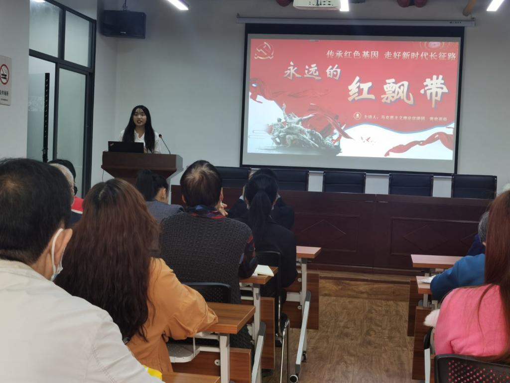 宣讲团讲师黎健雄以“百年红船、初心如磐”为题,详细阐释了红船精神的产生、内涵、意义及当代启示;唐丽媛以“向阳生长—百年大党的精神成长历程探析”为题,聚焦党的四个历史时期,以延安精神、焦裕禄精神、“两弹一星”精神和伟大抗疫精神为例,分别阐述了中国精神的丰富内涵及其背后蕴含的“以人民为中心”的发展理念;黄奕英姿以“传承长征精神,拼搏漫漫征途”为题,通过讲解长征故事,解析《七律·长征》,详细讲述了长征精神的丰富内涵、历史作用与时代价值。