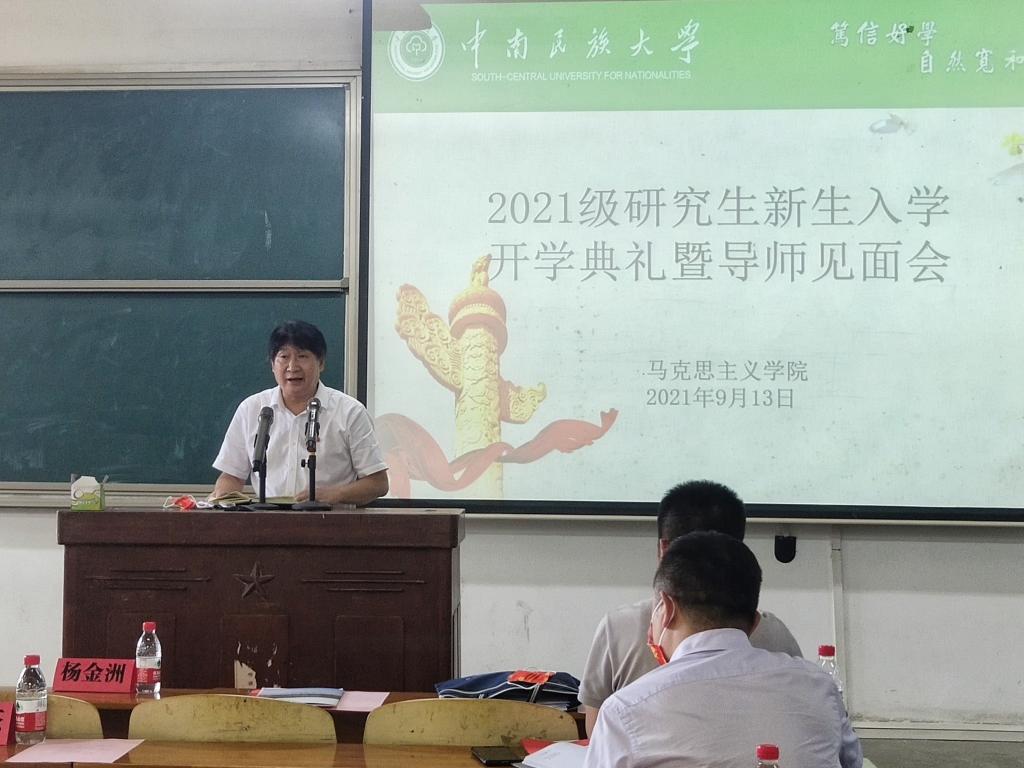 院长杨金洲就学院基本概况、师资力量及学科发展前景作了简要介绍,并从站位与定位两个方面对同学们提出了四点期待:一是系统学习专业课,认真完成课业任务;二是加强马克思主义经典著作阅读和习近平新时代中国特色社会主义思想的学习,并持续不断进行专业杂志的阅读,了解党的最新理论;三是遵守研究生规章制度、校纪校规,积极投入校院学生活动;四是增进身心健康,锻炼身体,陶冶心灵。