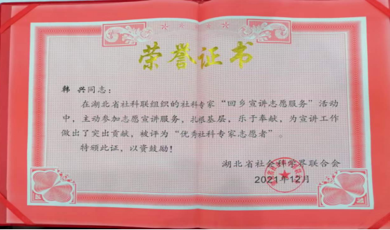 12月17日上午,在湖北省社会科学联合会举办的2021年回乡志愿宣讲总结交流会上,我院2019级思想政治教育专业本科生韩兴同学获评优秀社科专家宣讲志愿者,是唯一一名获邀参会并获誉的在读本科生。