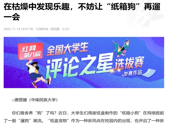 11月14日,我院思想政治教育专业20级本科生唐丽媛同学在湖南省主流媒体“红网”上发表题为《在枯燥中发现乐趣,不妨让“纸箱狗”再遛一会》的评论文章。唐丽媛同学是我院“南湖评论”团队专业课程思政实践育人平台中的一员,该篇文章也入围了红网第八届“全国大学生评论之星”选拔赛。这也是我院思想政治教育专业本科生在省级主流媒体发表的第三篇评论文章。