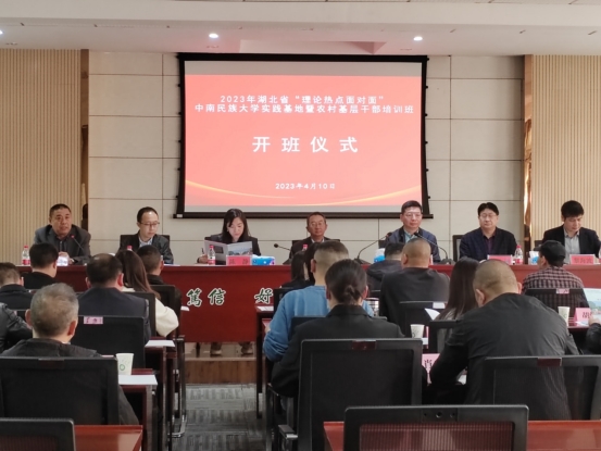 杨胜才校长对来自恩施州屯堡乡、三岔镇和阳新县半壁山农场的24名培训学员表示热烈的欢迎。他表示,培训民族地区基层干部是学校的一项重要职责。学校党委高度重视理论热点面对面实践基地的工作,马克思主义学院不断创新工作思路,优化宣讲形式,打通理论武装的最后一公里,连续七年被评为先进集体。他指出,为办好本次培训班,学校党委宣传部、马克思主义学院和培训中心精心部署,从前期接洽到课程安排、师资选派,再到后勤保障等方面高质量要求,培训内容采取“点单式”主题讲座,对接三个基层单位的实际需求,在充分发挥校内教育资源优势的同时,还汇聚了校外专家学者的力量,竭尽全力服务好乡村振兴视域下农村基层干部理论水平的提升,最后他预祝本次培训班办出水平、办出成效。
