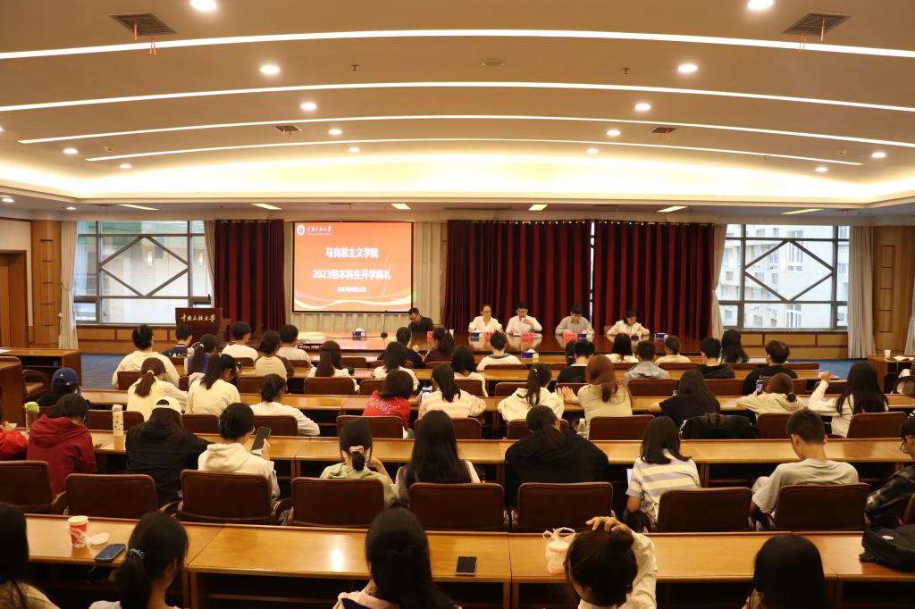 全体新生在2023级本科生王乐乐带领下进行入学宣誓。同学们宣读了“马院姓马,在马言马”的铿锵誓言,立志做马克思主义理论学习者、研究者、实践者、传播者、捍卫者,为实现中华民族伟大复兴奋斗终身。