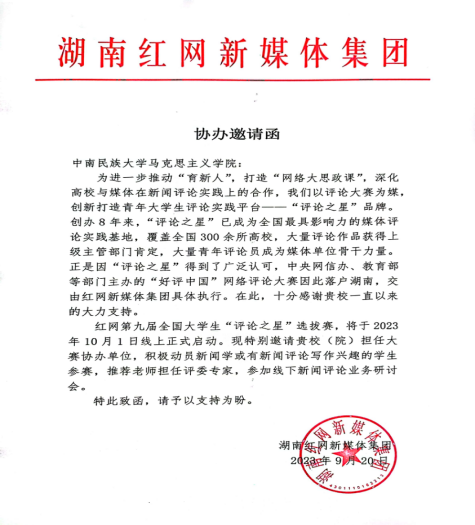 近日,湖南红网(湖南省新闻门户网)新媒体集团给我院来函,邀请我院担任“第九届全国大学生‘评论之星’选拔赛”协办单位。