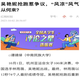 10月2日,我院思想政治教育专业2021级本科生谭靖倬在“红网”上发表题为《吴艳妮抢跑惹争议,“风凉”风气从何来?》的评论文章。文章讨论了中国选手吴艳妮在杭州亚运会女子100米决赛中抢跑导致成绩取消引发的争议,强调了正确理解事件经过、抛弃偏见、给予运动员尊重和支持的重要性。该文入围了红网第九届“全国大学生评论之星”选拔赛。