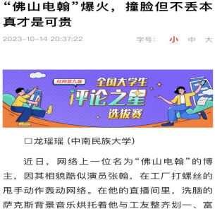10月14日,我院思想政治教育专业2021级本科生龙瑶瑶同学在“红网”上发表题了为《“佛山电翰”爆火,撞脸但不丢本真才是可贵》的评论文章。该文探讨了名为“佛山电翰”的网络博主因其长相酷似演员张翰而在网络上走红一事,指出“佛山电翰”虽然获得了巨大的关注和流量,却仍保持本心、不丢本真,强调了对工作的热情和坚守的重要性。该文入围了红网第九届“全国大学生评论之星”选拔赛。