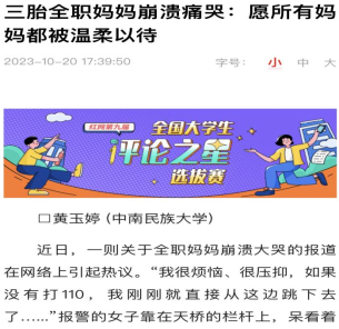 10月20日,我院思想政治教育专业2021级本科生黄玉婷在“红网”上发表题为《三胎全职妈妈崩溃痛哭:愿所有妈妈都被温柔以待》的评论文章。文章通过讲述一位三胎全职妈妈遭遇的困境和压力,呼吁社会更好地珍惜和爱护全职妈妈们的努力和奉献。该文入围了红网第九届“全国大学生评论之星”选拔赛。11月9日,黄玉婷又在“红网”发表题为《首届学青会为何在广西?夯实自身基础迎来发展机缘》的评论文章,介绍了第一届全国学生(青年)运动会在广西举办的原因和意义,鼓励青年要为实现国家伟大复兴贡献力量,为建设人类命运共同体共同努力。