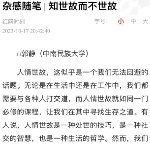 10月17日,我院思想政治教育专业2021级本科生郭静在“红网”上发表题为《知世故而不世故》的评论文章。文章认为人情世故是一门必修课程,强调了知世故而不世故的重要性,即在理解和应对人情世故的同时保持真实和真诚,在复杂的社会中保持独立和真实,成为知世故而不世故的人。该文入围红网第九届“全国大学生评论之星”选拔赛。