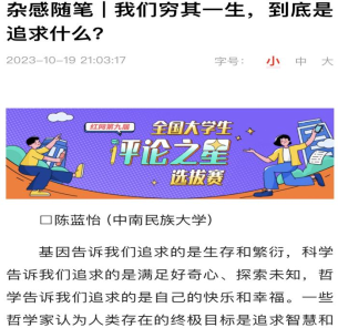 10月19日,我院思想政治教育专业2021级本科生陈蓝怡在“红网”上发表题为《我们穷其一生,到底是追求什么?》的评论文章。文章认为人们在追求物质财富和社会地位后常常感到内心空虚,而真正追求的是内心的平静和满足,呼吁人们要享受生命中的瞬间。该文入围了红网第九届“全国大学生评论之星”选拔赛。