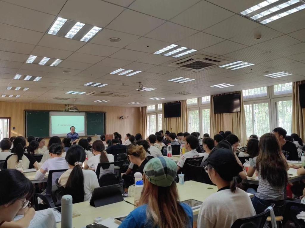 早上8点,舒服明一行在我院领导陪同下,首先来到文一楼311教室听取了易新涛教授主讲的“学术论文与应用文写作”课程。课堂上,易教授备课充分、精神饱满、讲授内容丰富生动,学生学习态度端正、积极参与互动、课堂气氛活跃。舒服明仔细听取授课内容、认真记录听课情况,并在课后与易教授进行了交流。
