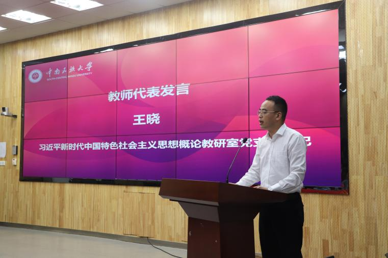 习近平新时代中国特色社会主义思想概论教研室党支部书记王晓作为教师代表发言。他在发言中期望同学们尽快适应研究生阶段的学习与生活,实现角色转换;明确目标、找准定位、怀揣梦想、脚踏实地;心存感恩、珍爱亲情、善待他人。他表示,研究生阶段只有学会感恩、敢于创新、加强协作,不断传承优良品质,才能获得成长。