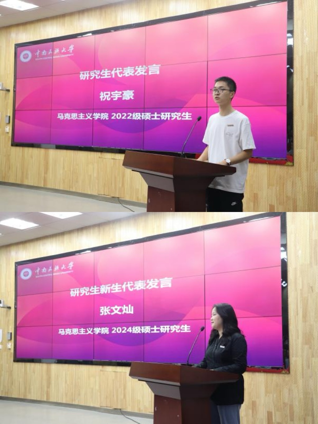 2022级党的建设专业研究生祝宇豪同学、2024级思想政治教育专业研究生张文灿同学,分别作为在校生代表、新生代表作了发言。他们分别从“立志”“修德”“博学”“实干”等角度与大家分享了各自的学习实践体会和对未来学习生活的规划,表示要与全体同学一道,在推进强国建设、民族复兴伟业中展现青春作为、彰显青春风采、贡献青春力量,奋力书写为中国式现代化挺膺担当的青春篇章。