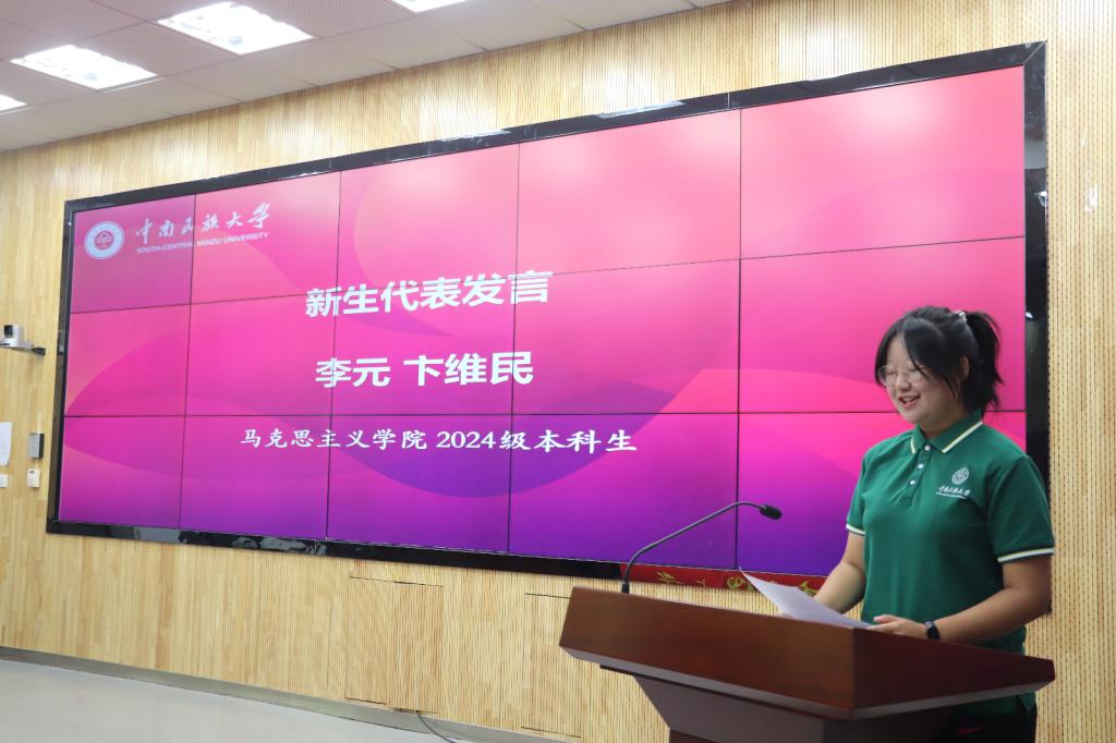 全体新生在2024级本科生蒋子欣的带领下进行了入学宣誓。同学们集体宣读了“马院姓马,在马言马”的铿锵誓言,立志成为马克思主义理论的学习者、研究者、实践者、传播者、捍卫者,为实现中华民族伟大复兴奋斗终身。